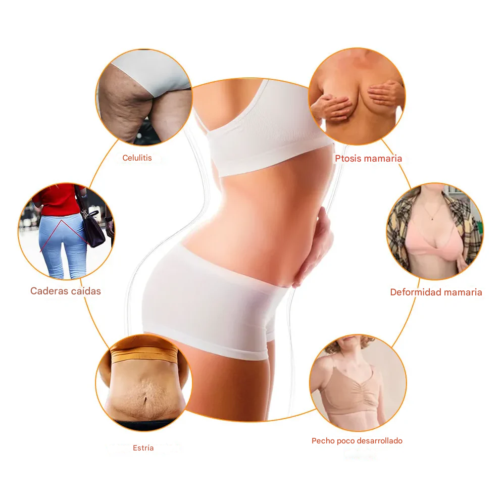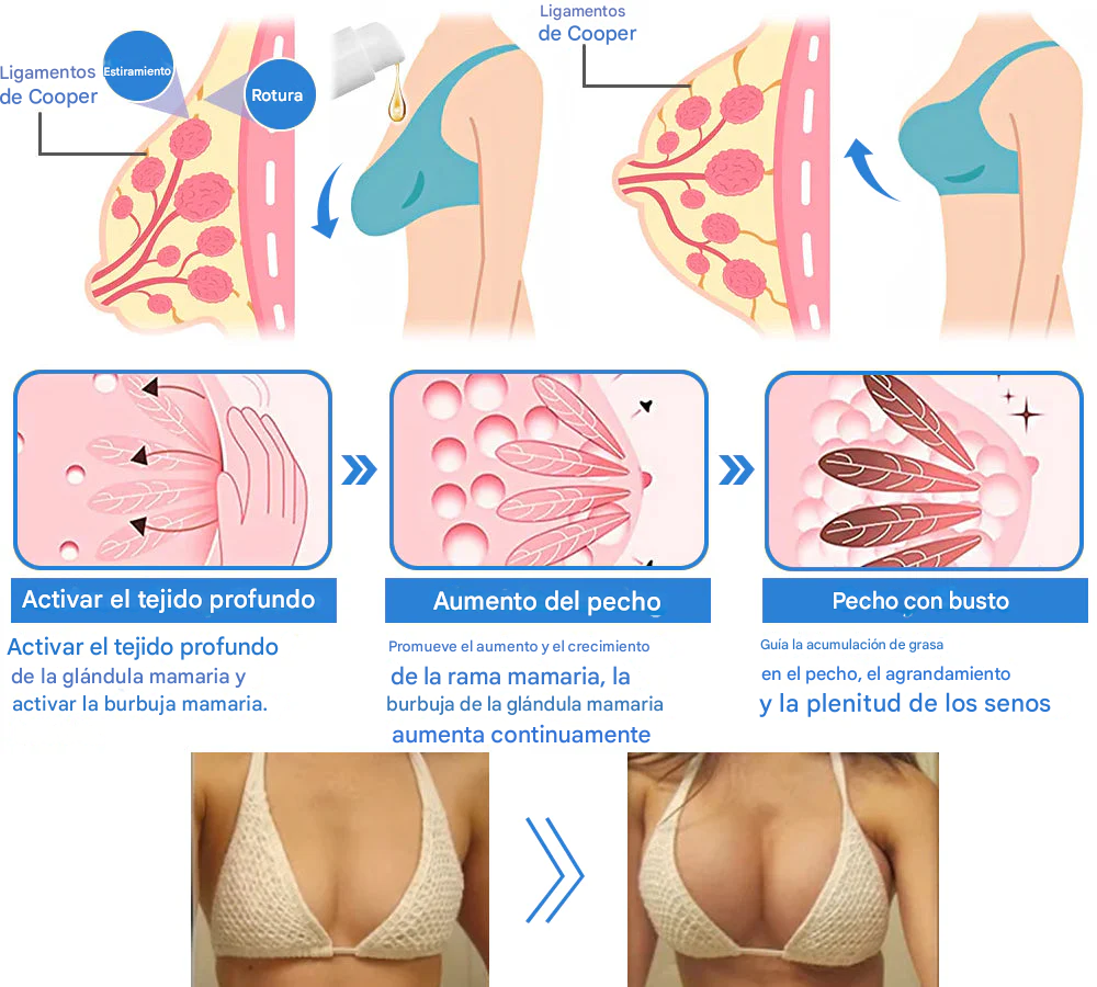 Ayuda a reafirmar, levantar y agrandar los senos, a la vez que alivia el dolor. Además, es un valioso apoyo para diversas afecciones, como el cáncer de mama, las mamas fibroquísticas, la mastectomía y el cuidado posoperatorio.