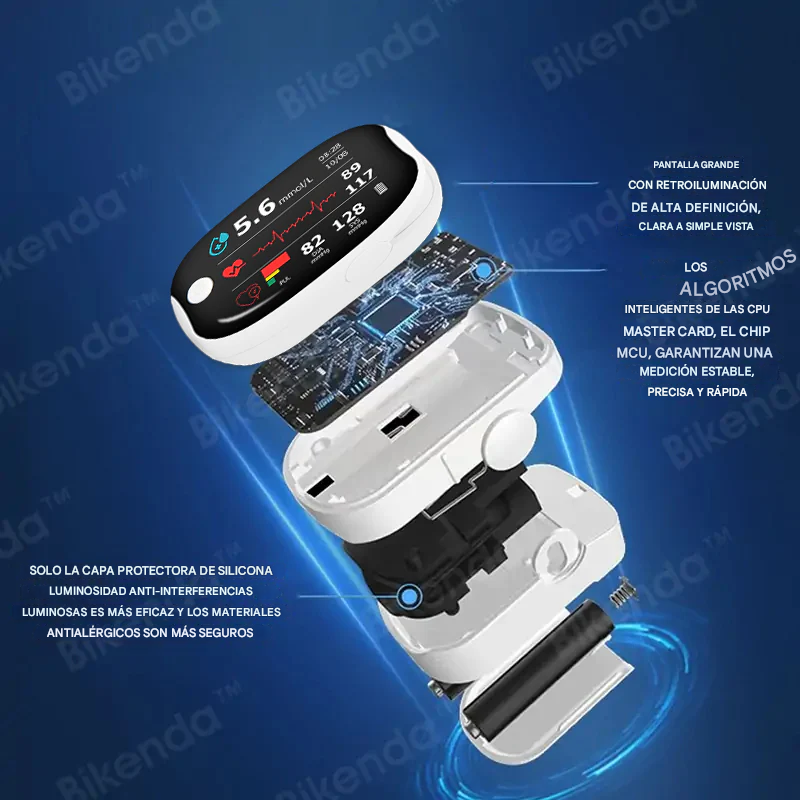 Bikenda™ cuenta con un potente chip interno con tecnología de algoritmo inteligente. Registra cada pulso con rapidez y precisión. Equipado con un chip controlador MCU de consumo ultrabajo, combinado con el avanzado algoritmo "LAMBERT BEER", captura rápidamente las señales de medición y ofrece resultados más rápidos y precisos. Utilizando la tecnología de chip de fotones y el proceso de medición de "espectro de absorción óptica", proporciona lecturas precisas de glucosa en sangre.